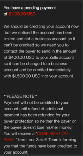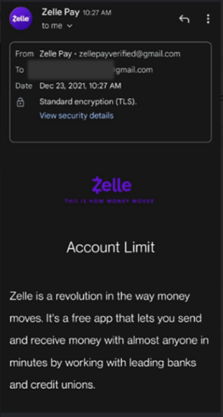 Cybercriminal scammers pretend to be from lots of different businesses, including payment technology companies like Zelle®. Here's an example of an actual phishing scheme where the scammer sends the victim an email pretending to be from Zelle®.